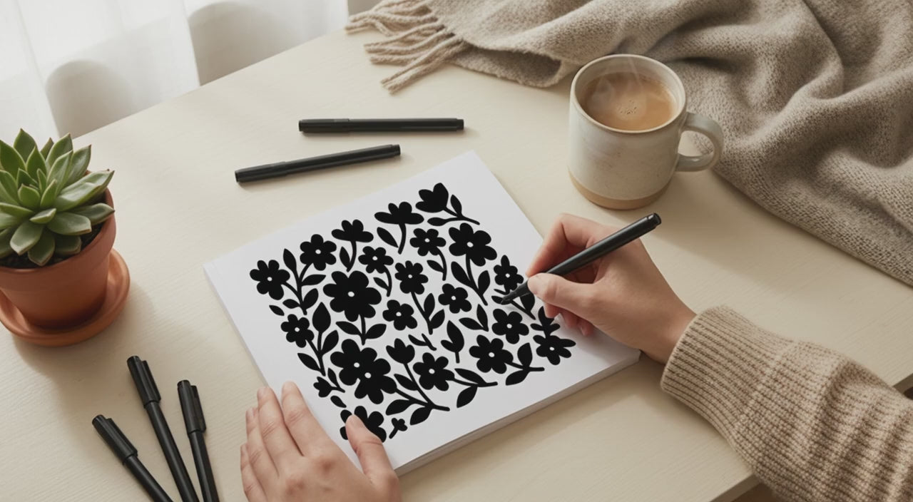 One pen. One color. Complete peace. The monochrome coloring book designed for overthinkers.
